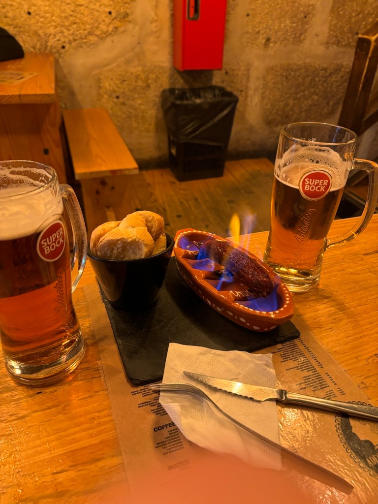 This is a flaming chorizo sausage eaten at a local pub. The fully cooked sausage is reheated with burning alcohol in a special created clay dish. The local beer in the Azores and Portugal mainland is Super Bock.