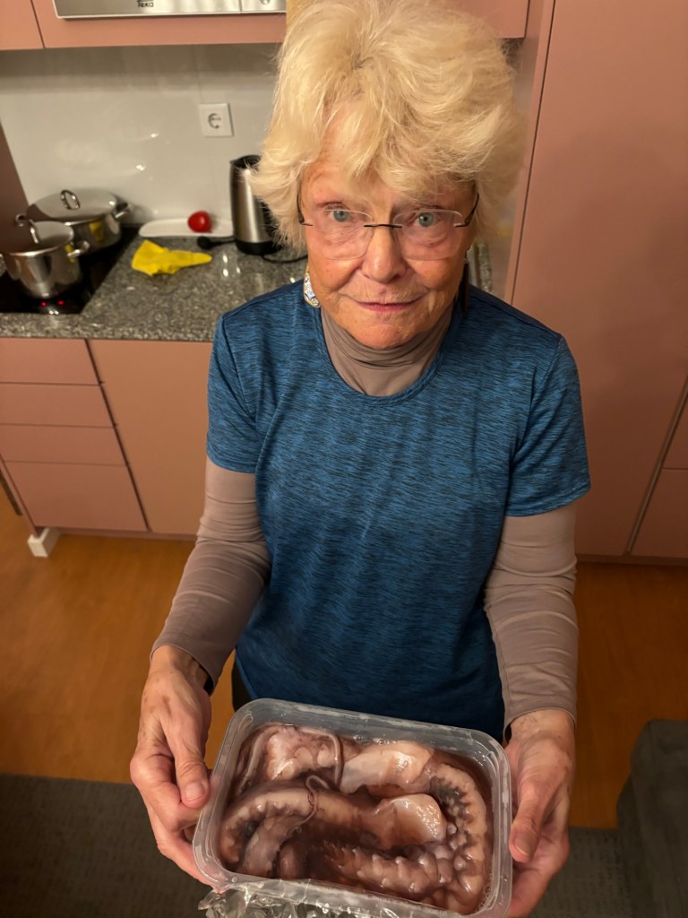 Louise thought she had bought a frozen package of shrimp to cook with rice. The package was mostly encased in frost. She did not read the label “tentacles, etc.”The surprise almost over shadowed the smell when she pulled off the thawed plastic packing lid.